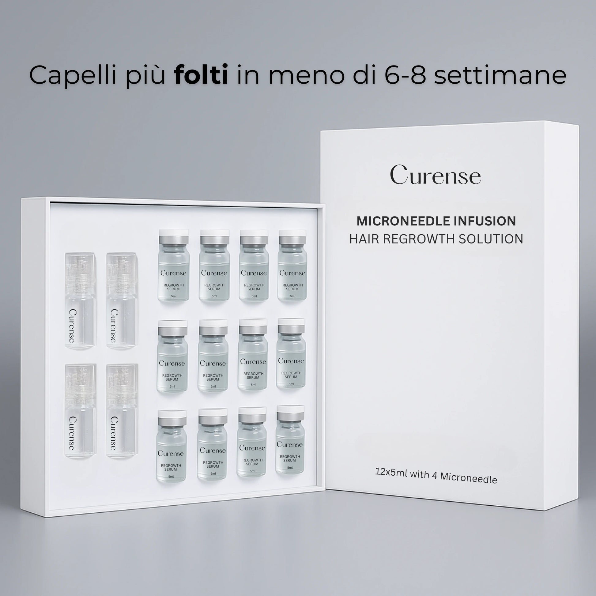 I microaghi del sistema Curense sono ultra-sottili, con una lunghezza di 0,5 mm. Sono realizzati in oro 24k e progettati per essere delicati e indolori, garantendo al contempo un efficace rilascio del siero nel cuoio capelluto.